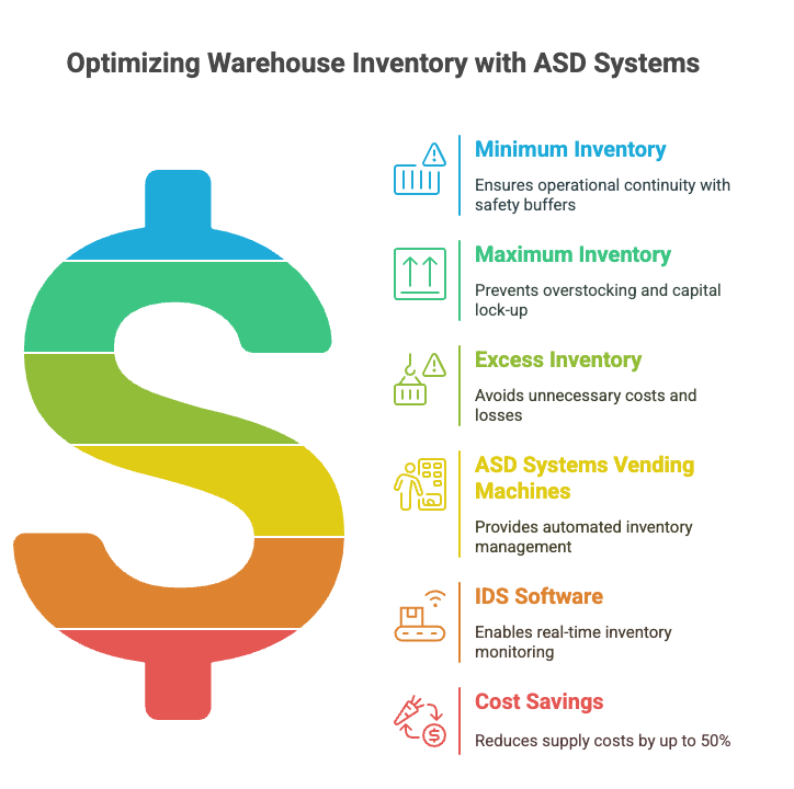 Place production and employee supplies in ASD vending machines. This reduces storage space, limits access, and enforces usage limits — cutting consumption and total stock volume.